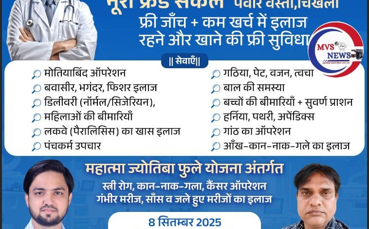 दि. ०८/०९/२०२५ को नूरी मस्जिद, पवार वस्ती, चिखली मे साजिद भाई खान (भावी नगर सेवक वार्ड क्र.2) की तरफ से ईद मिलाद के मौके पर फ्री हेल्थ चेकअप कैंप राख गया था उसमे काफी तादात मे लोगोने हिस्सा लिया. न्यू लाईफ हॉस्पिटल के डॉक्टरोने बहोत सहयोग दिया वही शफीउल्लह चौधरी ने भी खूप जिम्मेदारी निभाई.