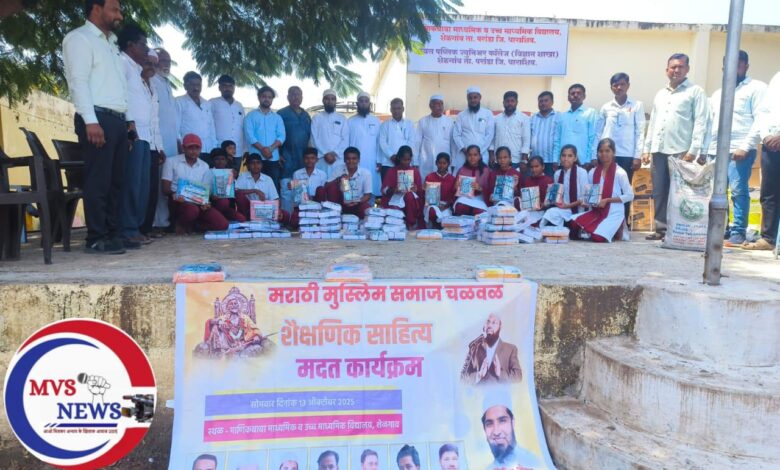 मराठी मुस्लिम समाज चळवळ यांच्या वतीने आज माणिकबाबा माध्यमिक व उच्च माध्यमिक विद्यालय, शेळगाव येथे विद्यार्थ्यांसाठी शैक्षणिक साहित्य वाटप कार्यक्रम पार पडला.